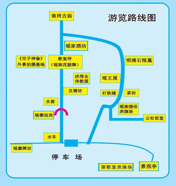 连南瑶族自治县是世界经典乐曲《瑶族舞曲》的故乡,是世界唯一排瑶聚居地,是距离珠三角最近,瑶族风情最浓郁的少数民族地区,距离广州市约200公里,从广州市到千年瑶寨经广清高速,清连高速公路,车程约2.5小时,全程均为高速。千年瑶寨,位于县城西南26公里的三排镇,海拔803米,占地面积159亩,鼎盛时期有民居700多幢、1000多户、7000多人,被称誉为首领排。古寨依山而建,房屋层叠,座落有致;石板道纵横交错,主次分明。此寨建于宋代,至今有千余年的历史。据专家考证,南岗是全国乃至全世界规模最大、最古老、最有特色的瑶寨。2007年11月列为广东省文物保护单位,2008年12月被评为“中国历史文化名村”。现居住在山寨的瑶民,主要有邓、唐、盘、房四个姓氏族,他们在元朝时代就建立民主选举的“瑶老制”,并形成了神圣而严厉的“习惯法”,严密管理山寨。新中国成立后,因移民下山,现古寨只保留有200余人和368幢明清时期的古宅及寨门、寨墙、石板道等。走进古寨,让人感受到瑶族历史的悠久和传统文化的“古典美”。神秘的瑶族婚俗表演,将用歌舞的形式展示出来,让游客感受和体验别具特色排瑶婚俗,共度那纯朴欢乐的时光。