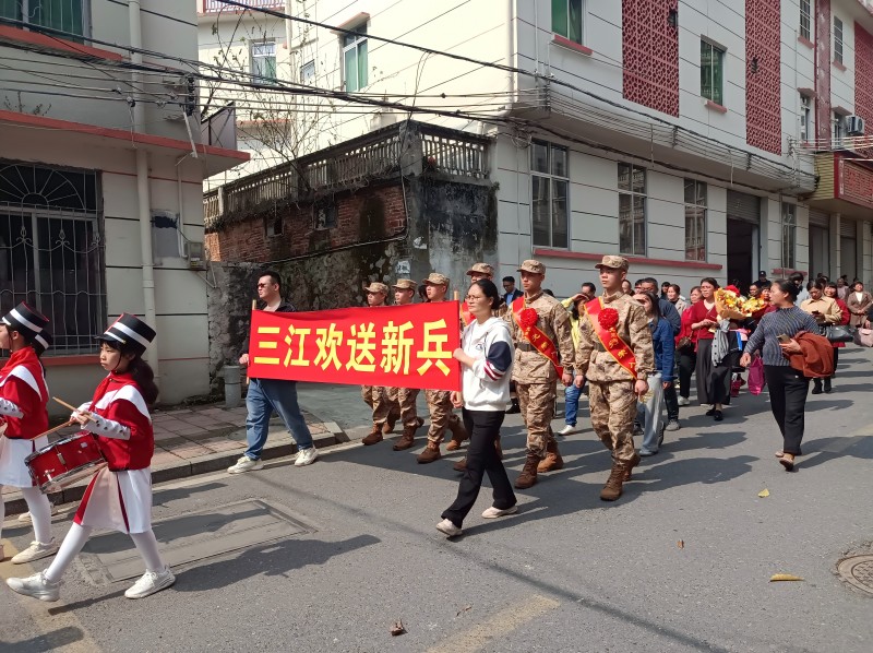 随后,三江镇武装部组织新兵沿街巡游。警察、欢送车辆、鼓号队、新兵及家属排成整齐队伍,锣鼓声声显壮志,离别依依故乡情,场面壮观,引来群众驻足拍照。鼓号队的小朋友们看到身穿军装、胸佩大红花的哥哥,激动万分,立志长大后也为保家卫国贡献一份力量。