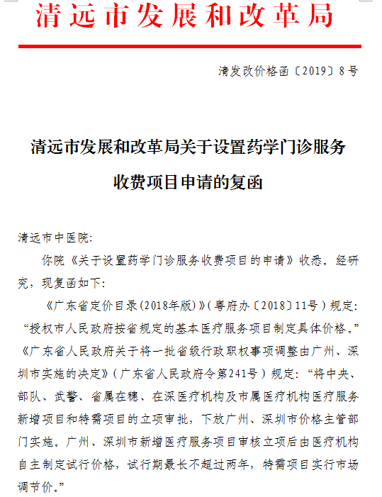 清远市发展和改革局关于设置药学门诊服务收费项目申请的复函