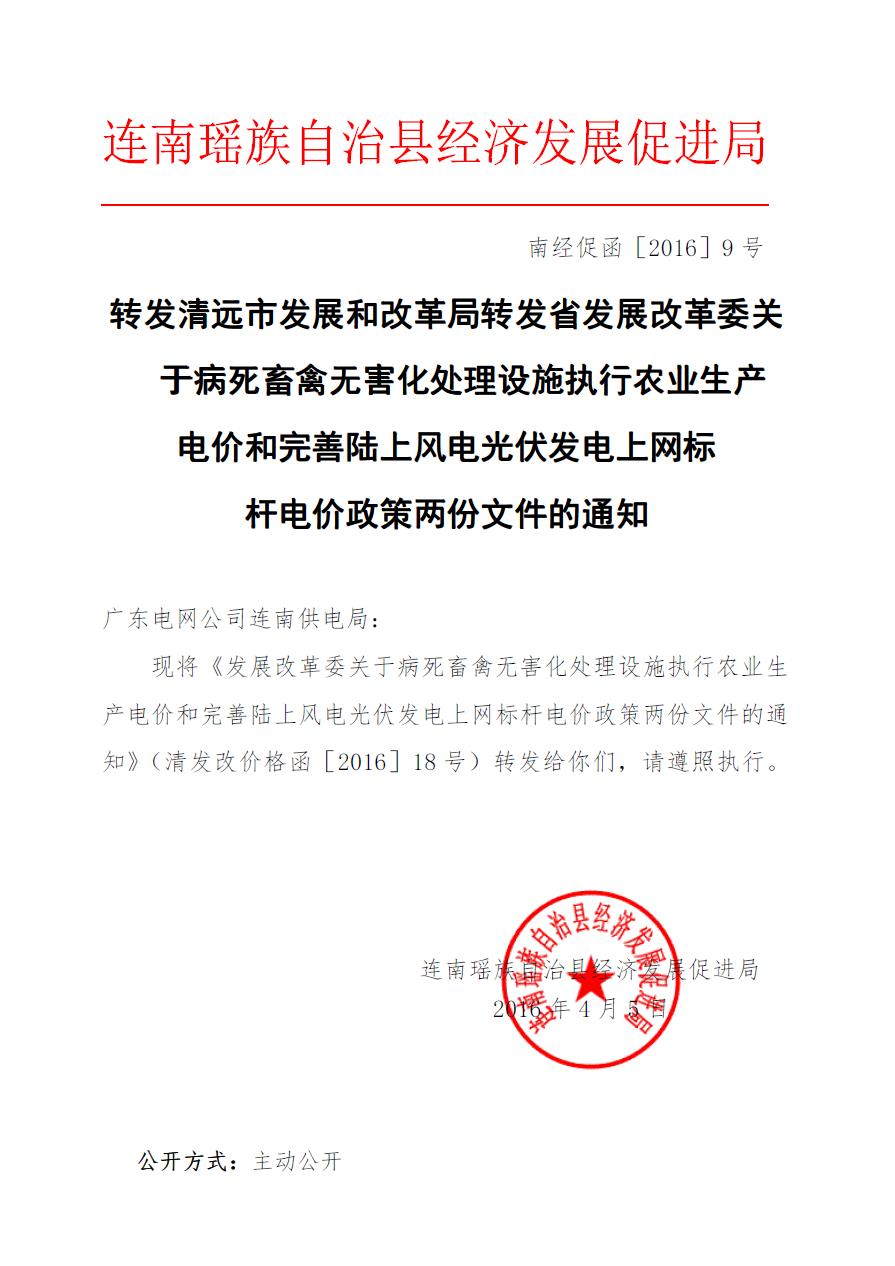 转清远市发展和改革局转发省发展改革委关于病死畜禽无害化处理设施执行农业生产电价和完善陆上风电光伏发电上网标杆电价政策两份文件的通知