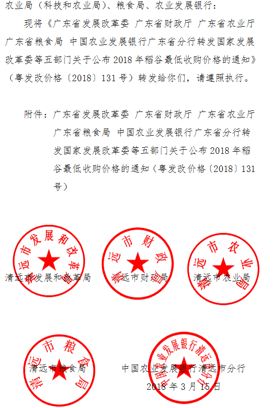 广东省发展改革委 广东省财政厅 广东省农业厅 广东省粮食局 中国农业发展银行广东省分行转发国家发展改革委等五部门关于公布2018年稻谷最低收购价格的通知(粤发改价格〔2018〕131号).pdf